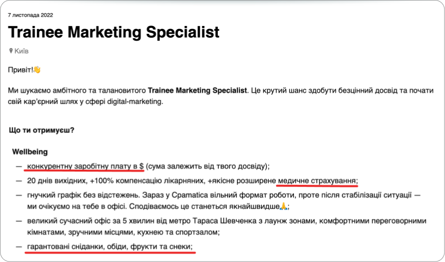 Так. Для цього ми показуємо, як правильно «запакувати» кейси, оформити резюме та сторінки в соцмережах. Ділимося свіжими вакансіями. Показуємо, як підготуватися до співбесід в українських та міжнародних компаніях.